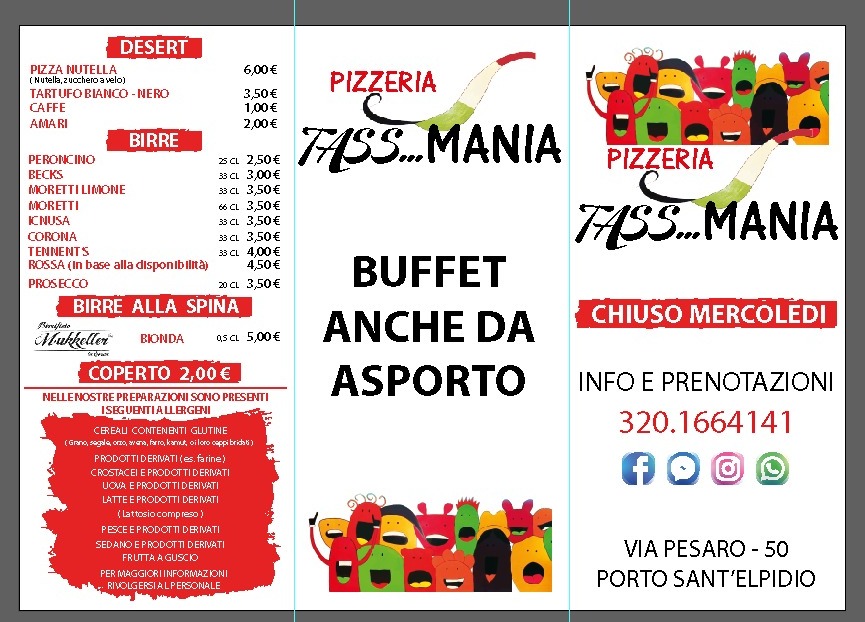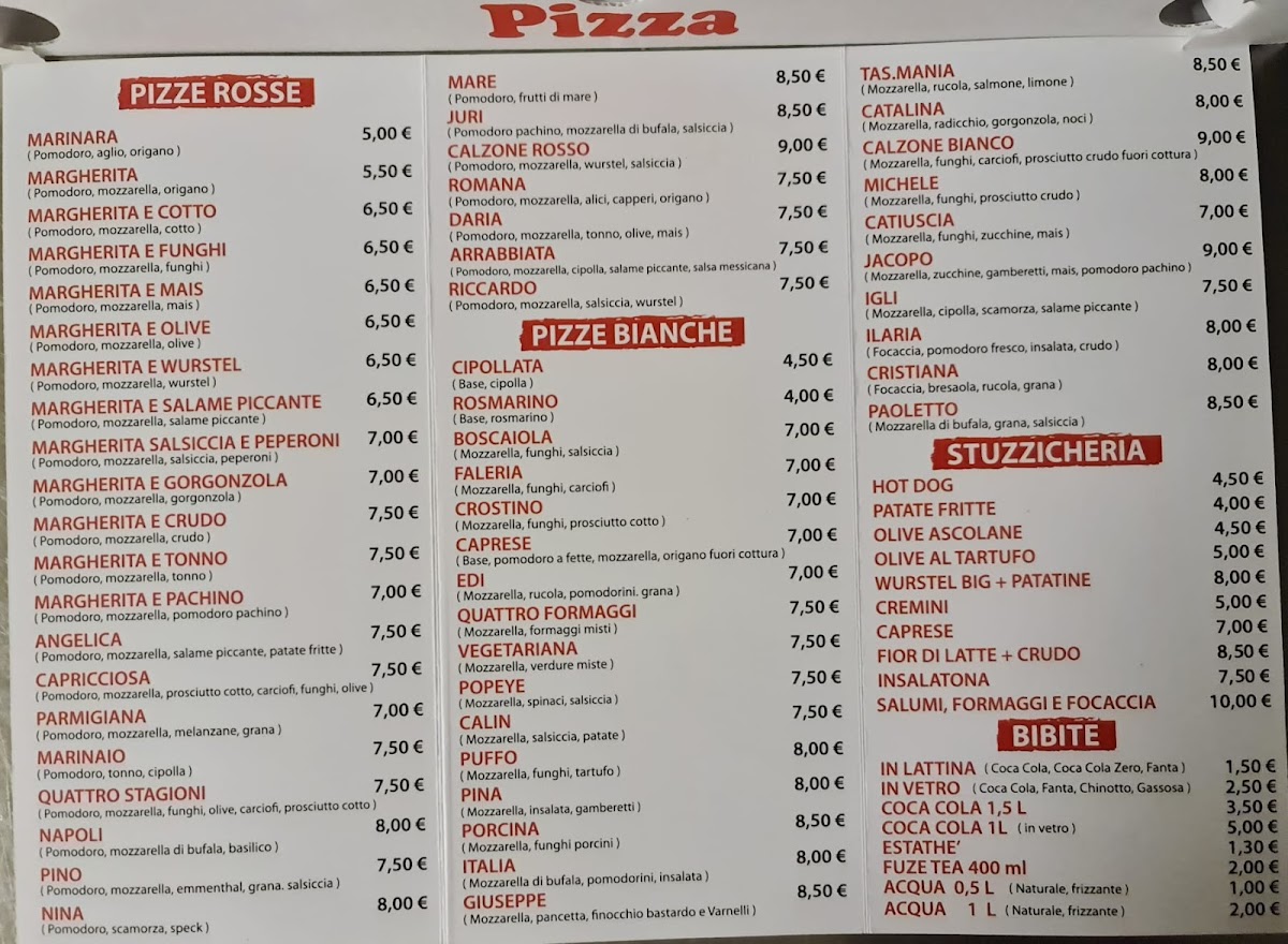 The menu offers a variety of pizza options along with a selection of beverages. It is divided into three main sections: Bevande (drinks), Pizze Rosse (red pizzas), and Pizze Bianche (white pizzas).